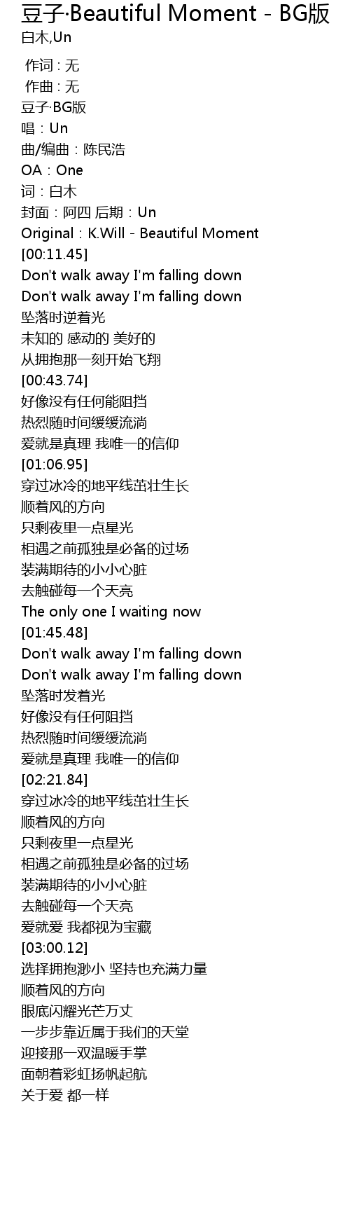 | [00:09.64] | Original:K.Will - Beautiful Moment |