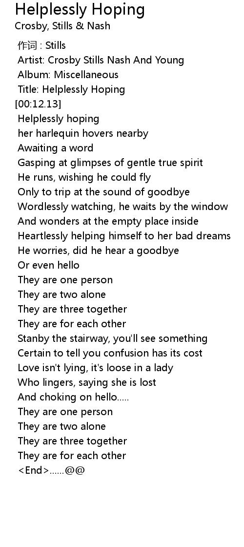 | [00:10.08] | Title: Helplessly Hoping |