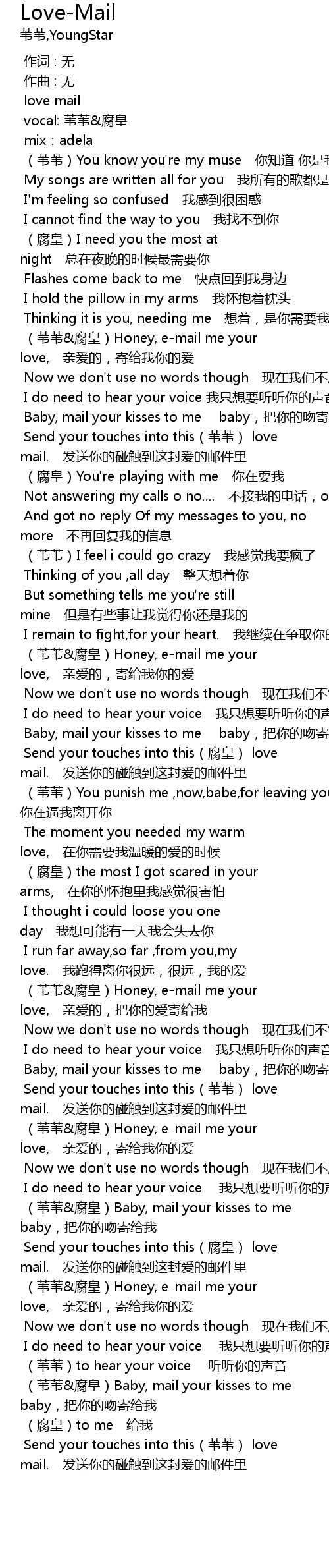 | [00:49.695] | (苇苇&腐皇)Honey, e-mail me your love, 亲爱的,寄给我你的爱 |
