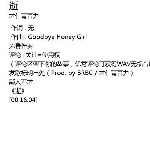 | [00:06.83] | fā gē biāo míng chū chù Prod. by BRBC cái rén qīng pǔ lì |