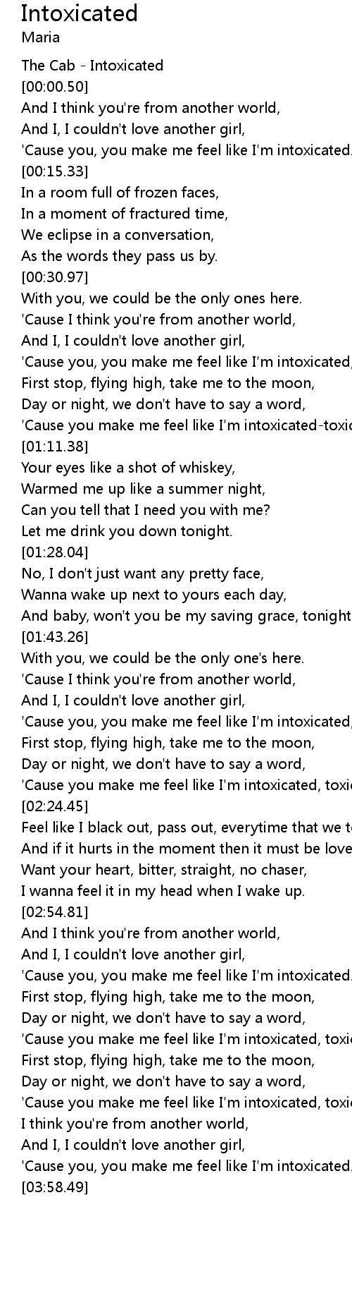 | [03:34.34] | 'Cause you make me feel like I'm intoxicated, toxicated. |