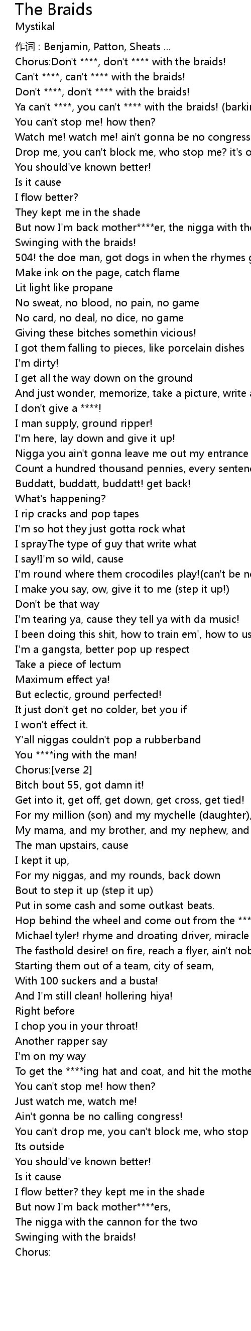 | Chorus:Don't ****, don't **** with the braids! | |