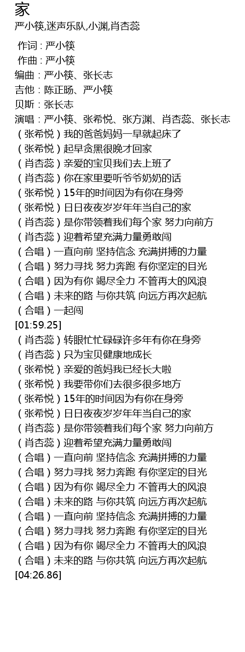 | [00:09.50] | 演唱:严小筷、张希悦、张方渊、肖杏蕊、张长志 |