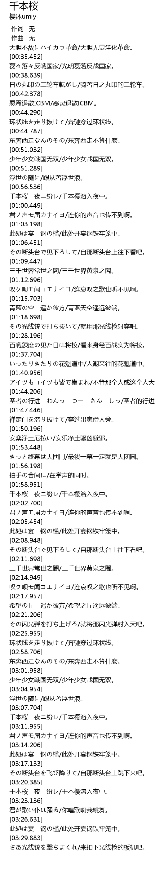 | [03:20.628] | 千本桜 夜ニ纷レ/千本樱溶入夜中。 |
