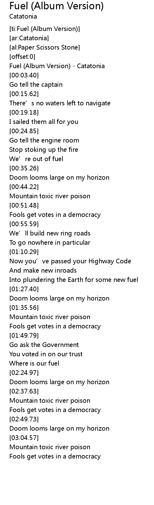 | [00:01.80] | Fuel (Album Version) - Catatonia |