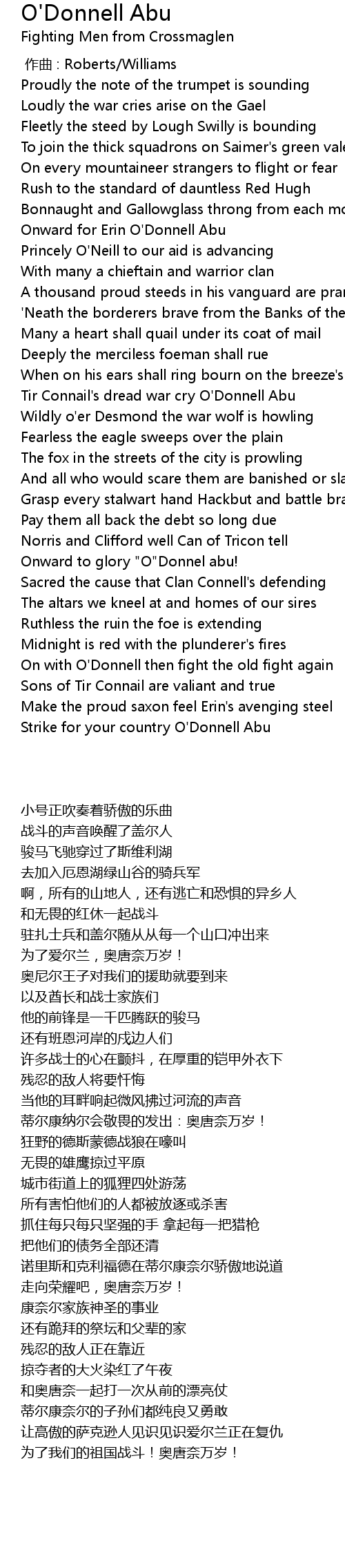 | [02:41.25] | Strike for your country O'Donnell Abu |