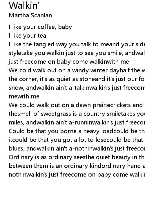 We could walk out on a dawn prairiecrickets and birds a-startin to sing, and thesmell of sweetgrass is a country smiletakes you in and then it lasts for miles, andwalkin ain't a-runninwalkin's just freecome on baby come walkinwith me |