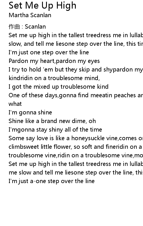 | Set me up high in the tallest treedress me in lullabies and old blue jeansrock me slow and tell me liesone step over the line, this time | |