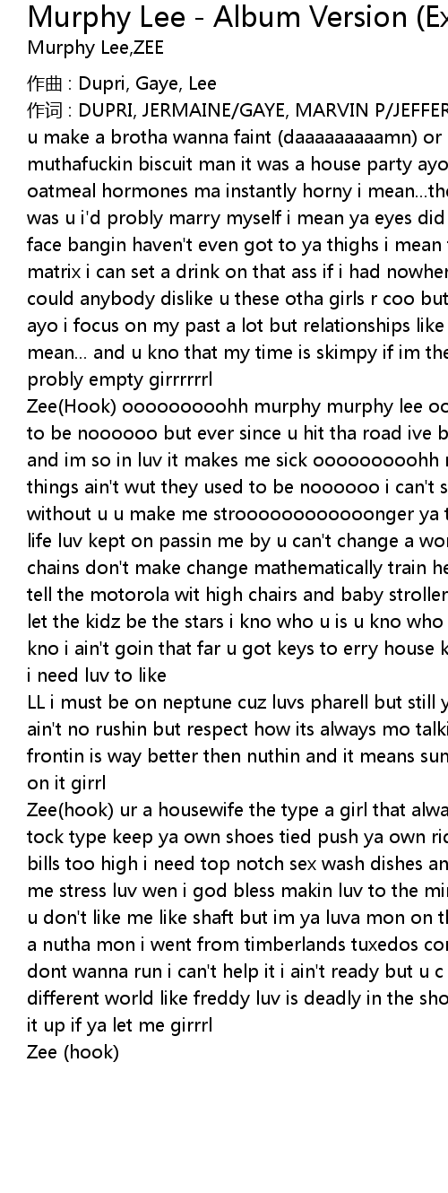| Zee Hook ooooooooohh murphy murphy lee ooooooooohh things ain' t wut they used to be noooooo but ever since u hit tha road ive been spittin this relationship and im so in luv it makes me sick ooooooooohh murphy murphy leeeee ooooooooohh things ain' t wut they used to be noooooo i can' t spend this time alone i teel ya without u u make me stroooooooooooonger ya too fly to ba askin a guy why all my life luv kept on passin me by u can' t change a woman by diamond chainin her chains don' t make change mathematically train her its a 2 way thing got scott tell the motorola wit high chairs and baby strollers i be the sun u be the moon let the kidz be the stars i kno who u is u kno who u r and wen the door close u kno i ain' t goin that far u got keys to erry house keys to erry car and hell yea i need luv to like | |