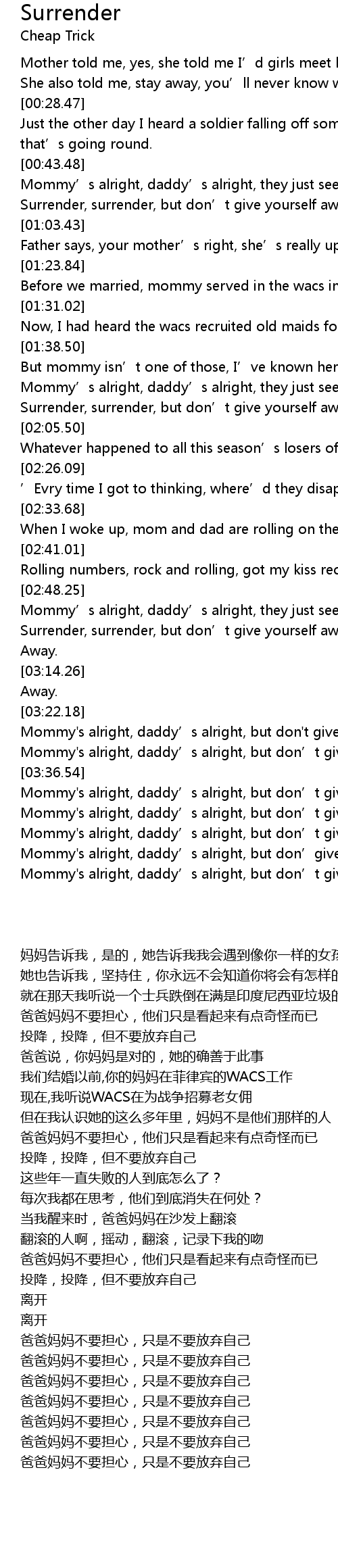 | [03:23.55] | Mommy's alright, daddy’s alright, but don't give yourself away |