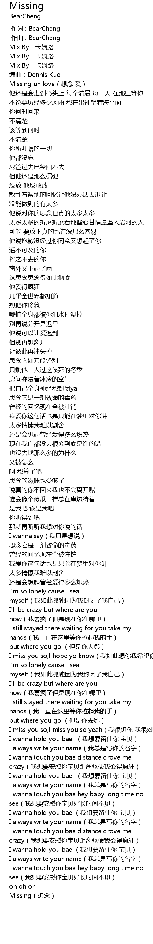 | [00:19.573] | Missing uh love xiǎng niàn ài |