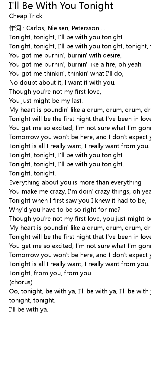 | Tonight, tonight, I' ll be with you tonight, tonight, tonight. | |