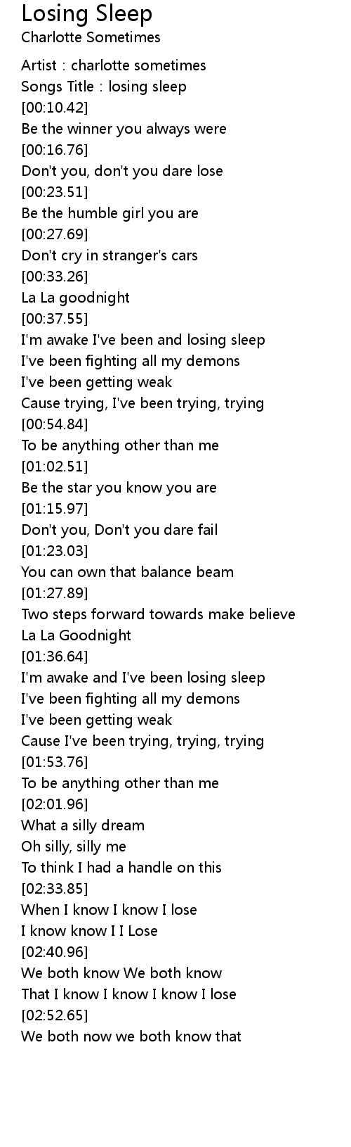 | [00:39.93] | I'm awake I've been and losing sleep |