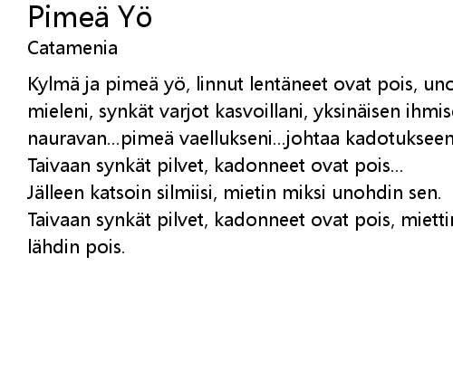 | Kylm ja pime y, linnut lent neet ovat pois, unohduksien ilta peitt mieleni, synk t varjot kasvoillani, yksin isen ihmisen, n en nauravan... pime vaellukseni... johtaa kadotukseen. | |
