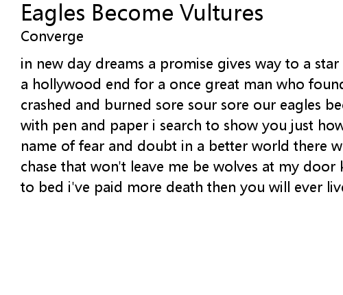 in new day dreams a promise gives way to a star struck death and a gold disease a hollywood end for a once great man who found death on his knees cashed in crashed and burned sore sour sore our eagles become our vultures i've searched with pen and paper i search to show you just how far i broke from myself in the name of fear and doubt in a better world there would be a better me without the chase that won't leave me be wolves at my door keep all your wars i'm going home to bed i've paid more death then you will ever live