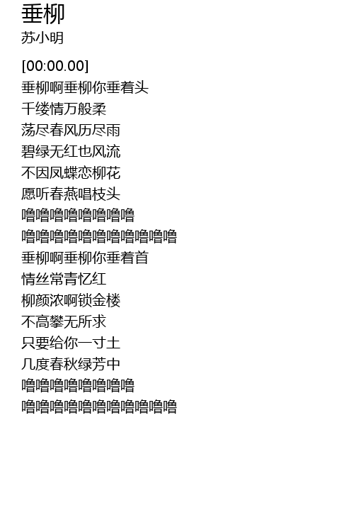 | [00:17.88] | chuí liǔ a chuí liǔ nǐ chuí zhe tóu |