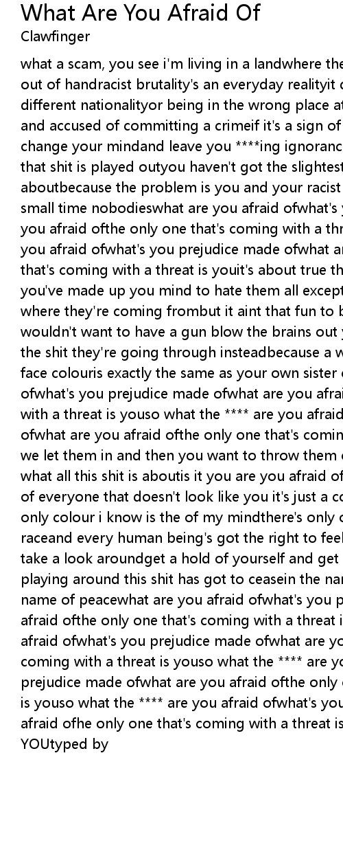 what a scam, you see i'm living in a landwhere the present situation is getting out of handracist brutality's an everyday realityit doesn't take more than a different nationalityor being in the wrong place at the wrong timeto get abused and accused of committing a crimeif it's a sign of the time then it's time to change your mindand leave you ****ing ignorance way behindso face the facts cos that shit is played outyou haven't got the slightest clue what you're talking aboutbecause the problem is you and your racist buddiesprejudice right wing small time nobodieswhat are you afraid ofwhat's you prejudice made ofwhat are you afraid ofthe only one that's coming with a threat is youso what the **** are you afraid ofwhat's you prejudice made ofwhat are you afraid ofthe only one that's coming with a threat is youit's about true the real problem is youbecause you've made up you mind to hate them all except yousay send them all back to where they're coming frombut it aint that fun to be living on the runyou wouldn't want to have a gun blow the brains out your headso try to understand the shit they're going through insteadbecause a woman or a man with a different face colouris exactly the same as your own sister or brotherwhat are you afraid ofwhat's you prejudice made ofwhat are you afraid ofthe only one that's coming with a threat is youso what the **** are you afraid ofwhat's you prejudice made ofwhat are you afraid ofthe only one that's coming with a threat is youso first we let them in and then you want to throw them outwell i'd really like to know what all this shit is aboutis it you are you afraid of what's neware you afraid of everyone that doesn't look like you it's just a colourand i'm colour blindthe only colour i know is the of my mindthere's only one race and that's the human raceand every human being's got the right to feel safeso stop this insanity and take a look aroundget a hold of yourself and get your feet on the groundstop playing around this shit has got to ceasein the name of understanding in the name of peacewhat are you afraid ofwhat's you prejudice made ofwhat are you afraid ofthe only one that's coming with a threat is youso what the **** are you afraid ofwhat's you prejudice made ofwhat are you afraid ofthe only one that's coming with a threat is youso what the **** are you afraid ofwhat's you prejudice made ofwhat are you afraid ofthe only one that's coming with a threat is youso what the **** are you afraid ofwhat's you prejudice made ofwhat are you afraid ofhe only one that's coming with a threat is |
