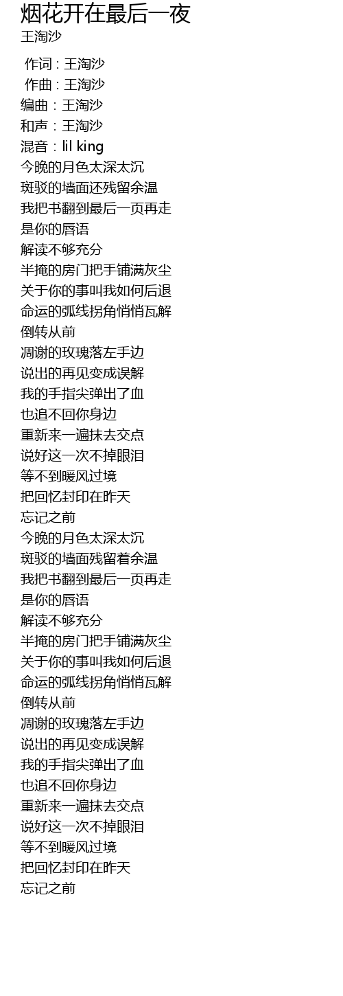 | [00:00.000] | 作词 : 王淘沙 |
