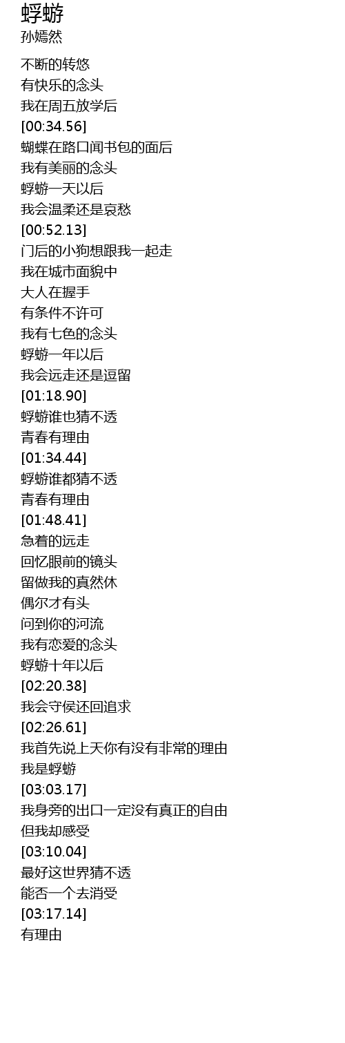 | [00:35.13] | 蝴蝶在路口闻书包的面后 |