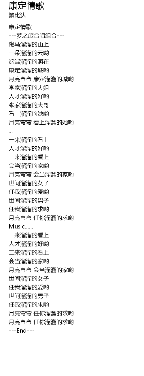 | [00:34.05] | 月亮弯弯 康定溜溜的城哟 |