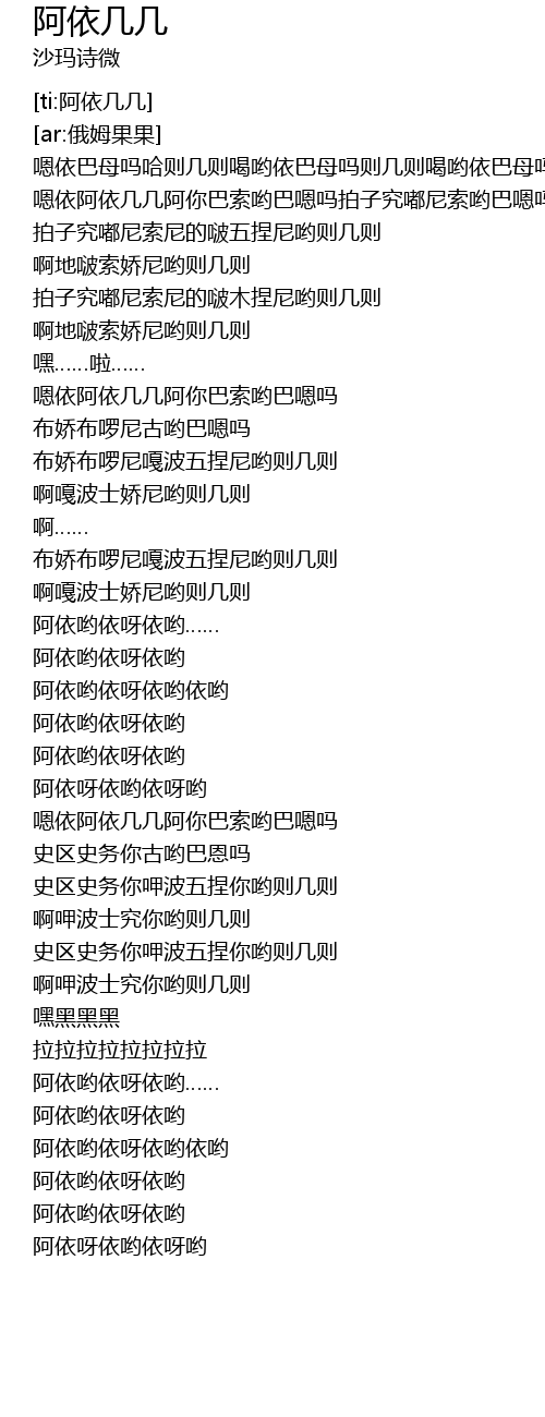 | [00:01.519] | 嗯依巴母吗哈则几则喝哟依巴母吗则几则喝哟依巴母吗则几则喝哟依巴母吗则几则喝哟依哟依 |