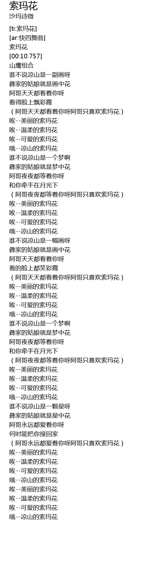 | [00:40.11] | (阿哥天天都看着你呀阿哥只喜欢索玛花) |