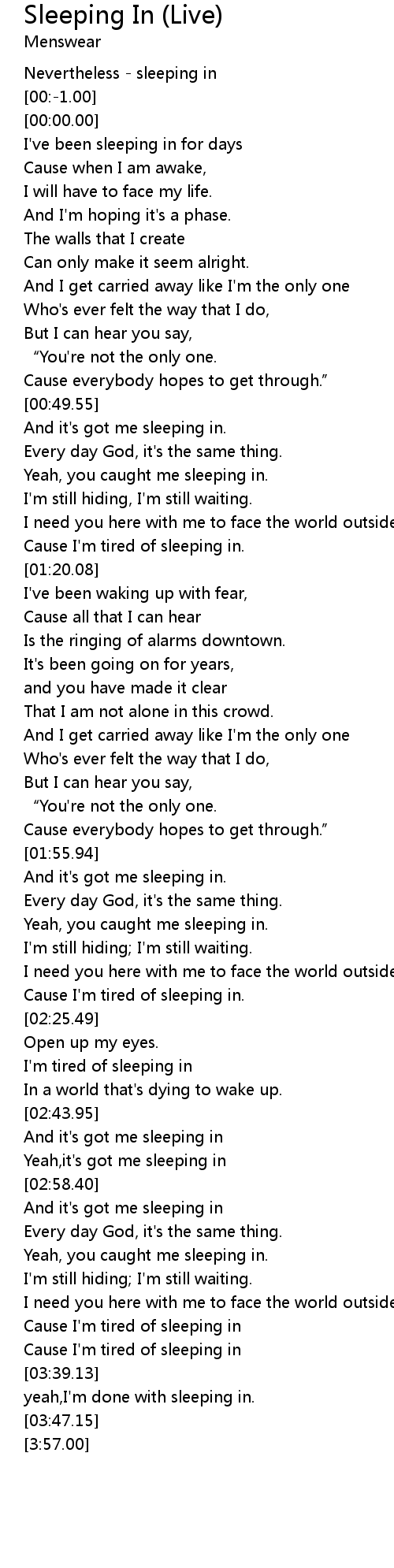 | [03:34.44] | Cause I' m tired of sleeping in |