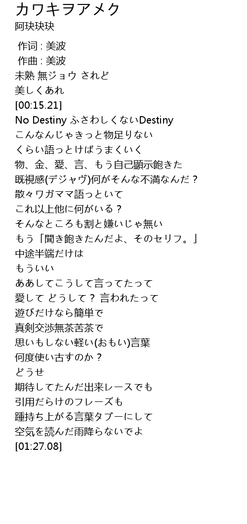 | [00:22.18] | No Destiny ふさわしくないDestiny |