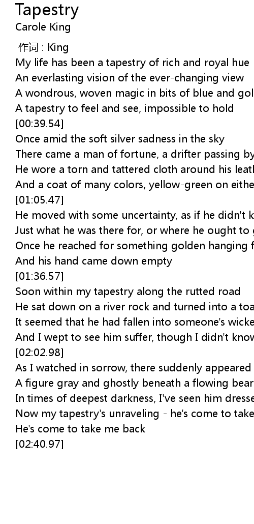 | [02:21.94] | Now my tapestry's unraveling - he's come to take me back |