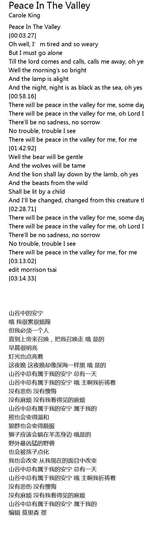 | [03:04.22] | There will be peace in the valley for me, for me |