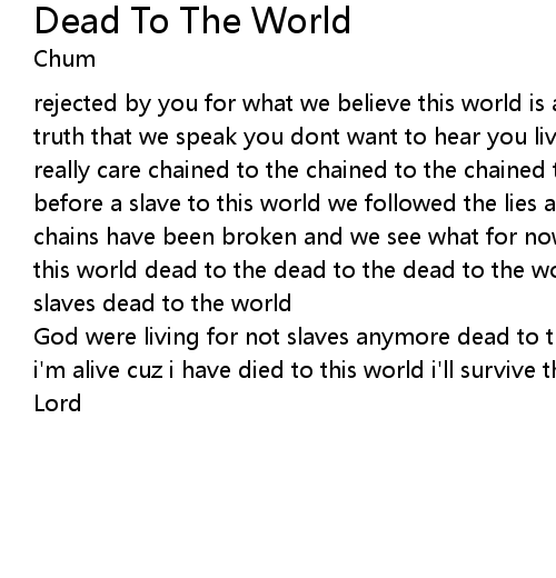 | rejected by you for what we believe this world is a lie and you can not see the truth that we speak you dont want to hear you live for your world and you dont really care chained to the chained to the chained to the world weve been there before a slave to this world we followed the lies and the truth we ignored our chains have been broken and we see what for now we have freedom cuz were dead to this world dead to the dead to the dead to the world dead to the world not slaves dead to the world | |