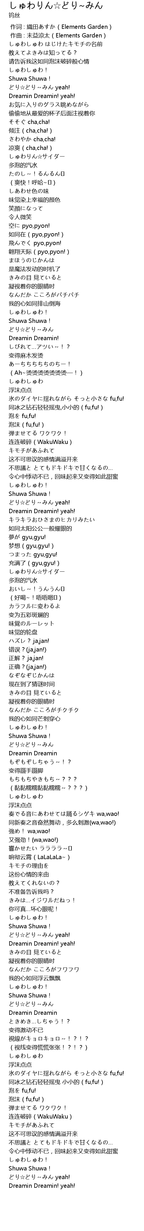 | [00:00.195] | しゅわしゅわ はじけたキモチの名前 教えてよきみは知ってる? |
