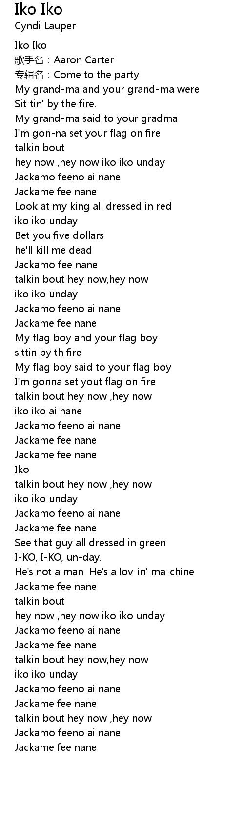 | [00:05.53] | Iko Iko |