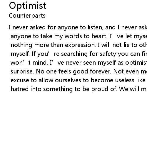 | won' t mind. I' ve never seen myself as optimistic, so this should come as no | |
