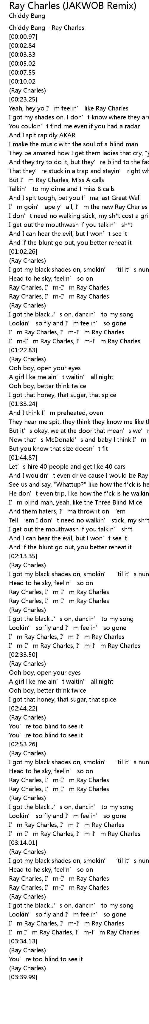 | [03:32.57] | I' m I' m Ray Charles, I' mI' m Ray Charles |