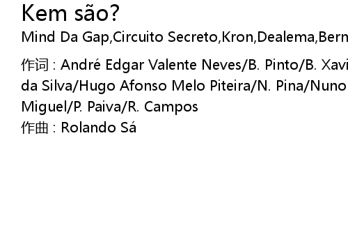| 作词 : André Edgar Valente Neves/B. Pinto/B. Xavier/Edmundo Carlos Cerqueira da Silva/Hugo Afonso Melo Piteira/N. Pina/Nuno Manuel Dias Carneiro/Nuno Miguel/P. Paiva/R. Campos | |