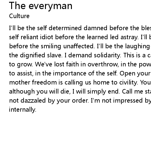 I'll be the self determined damned before the blessed lump of clay. I'll be the self reliant idiot before the learned led astray. I'll be the unroly overreactor before the smiling unaffected. I'll be the laughing-stock revolutionary before the dignified slave. I demand solidarity. This is a call to arms. But you refuse to grow. We've lost faith in overthrow, in the power to resist, in the strenght to assist, in the importance of the self. Open your eyes, heteronome...our mother freedom is calling us home to civility. You will die the everyman. And although you will die, I will simply end. Call me status quomophobic, but I'm not dazzaled by your order. I'm not impressed by amenities...I will be governed internally. |