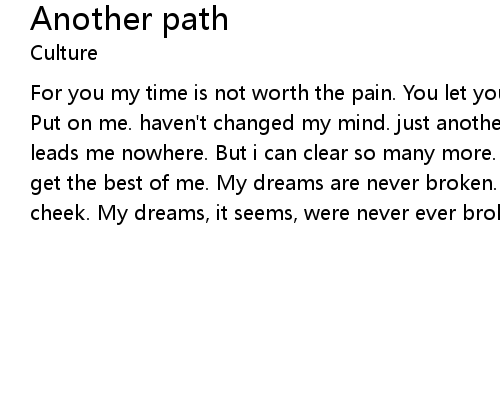 | For you my time is not worth the pain. You let your fears get the best of you. Put on me. haven't changed my mind. just another way to escalate. Another path leads me nowhere. But i can clear so many more. And this is one time i'll let it get the best of me. My dreams are never broken. I found a new release, tongue in cheek. My dreams, it seems, were never ever broken. |