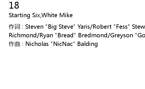 | 作词 : Steven "Big Steve" Yaris/Robert "Fess" Stewart/Jared "Riggsz" Richmond/Ryan "Bread" Bredmond/Greyson "Goose" Tarantino/White Mike | |