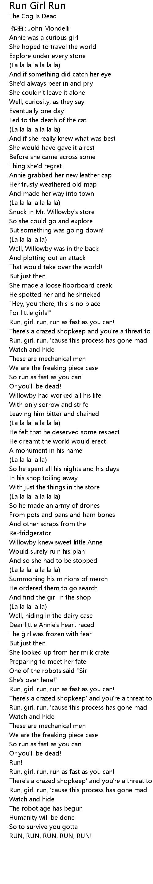 | [02:46.18] | Run, girl, run, 'cause this process has gone mad |