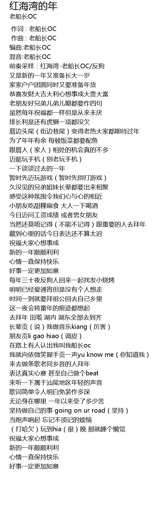 | [00:14.764] | 前奏采样:红海湾-老船长OC/反狗 |