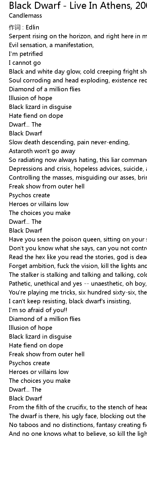 | I can' t keep resisting, black dwarf' s insisting, | |