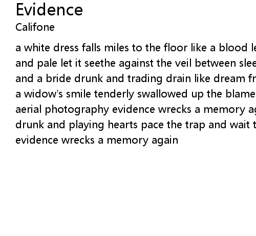a white dress falls miles to the floor like a blood letting promises colorblind and pale let it seethe against the veil between sleep and now a dog, an exorcist and a bride drunk and trading drain like dream from wine dark eyes a baby smiles a widow's smile tenderly swallowed up the blame and shat out the bones and fur aerial photography evidence wrecks a memory again a dog an exorcist and a bride drunk and playing hearts pace the trap and wait to let this long shadow pass evidence wrecks a memory again |