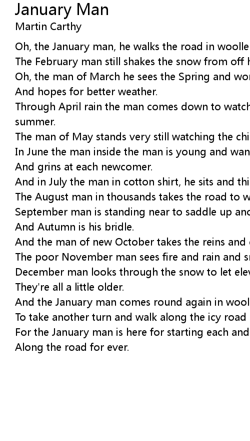 Oh, the January man, he walks the road in woollen coat and boots of leather. |