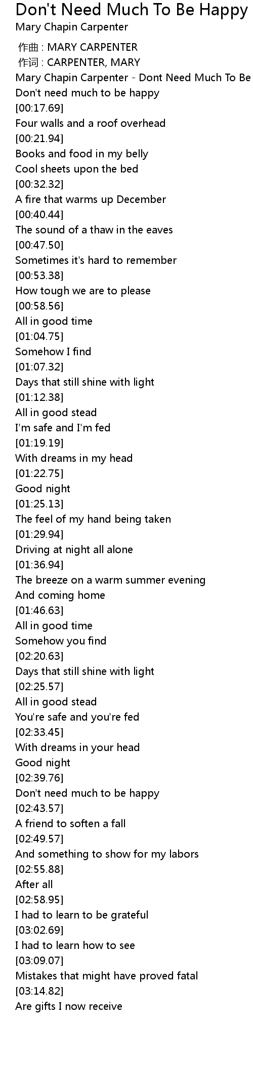 | [00:00.62] | Mary Chapin Carpenter Dont Need Much To Be Happy |