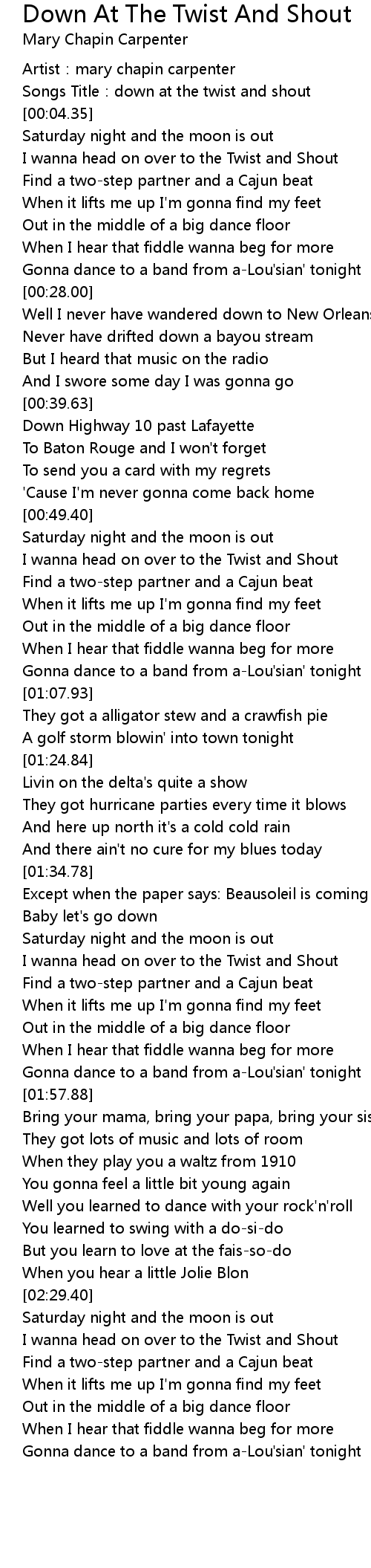 | [02:32.40] | I wanna head on over to the Twist and Shout |
