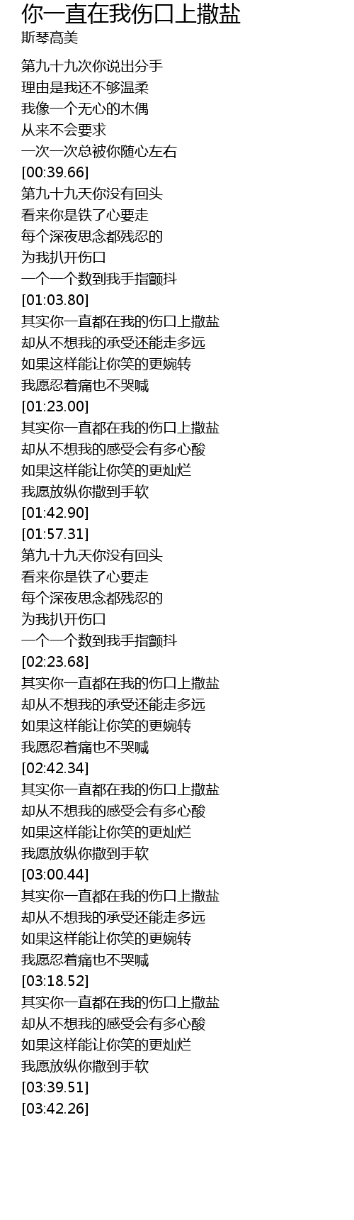 | [03:00.73] | 其实你一直都在我的伤口上撒盐 |