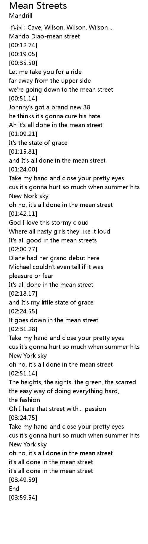 | [00:48.29] | we're going down to the mean street |