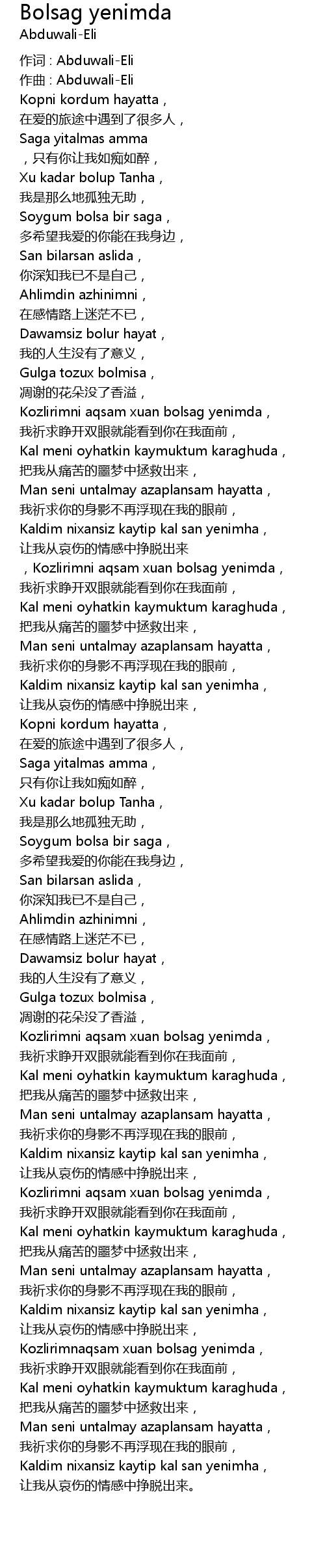 | , Kozlirimni aqsam xuan bolsag yenimda, | |