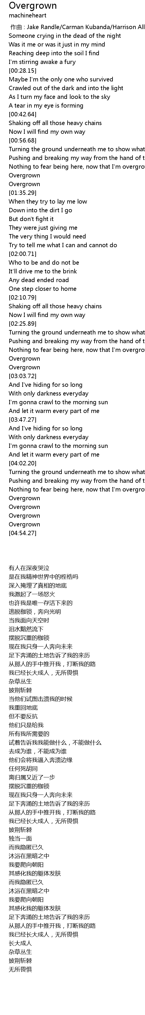| [04:17.58] | Nothing to fear being here, now that I'm overgrown |